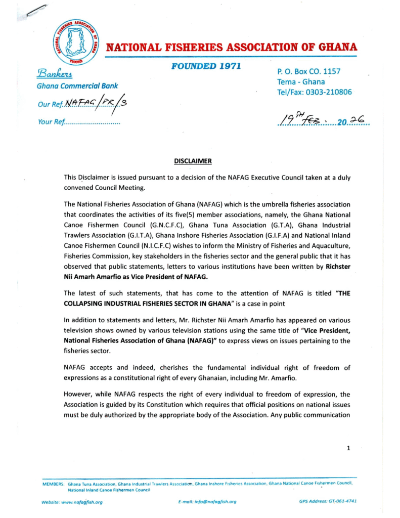 NAFAG ISSUES DISCLAIMER February 26, 2026 Posted by: Nafag Writer Category: News No Comments DISLAIMER Download the full Document here National Fisheries Association of Ghana (NAFAG) get a quote